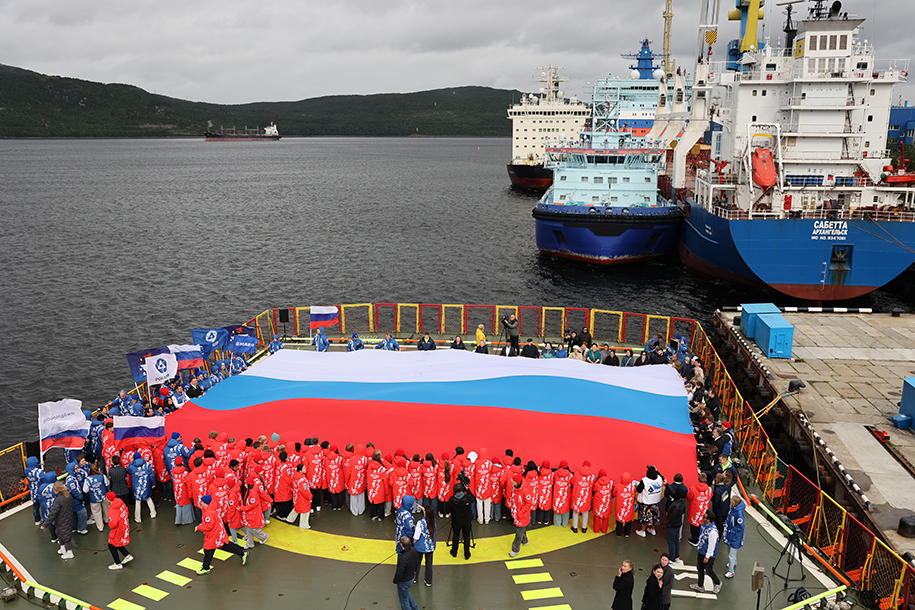 В честь Дня Государственного флага России на церемонии прибытия ее участники развернули на борту атомного ледокола «50 лет Победы» триколор.