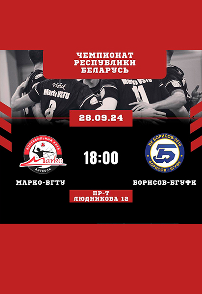 Команды МАРКО-ВГТУ и БОРИСОВ-БГУФК сразятся между собой в матче в рамках ЧЕМПИОНАТА РЕСПУБЛИКИ БЕЛАРУСЬ по волейболу завтра в 18.00 на стадионе ЦСК.