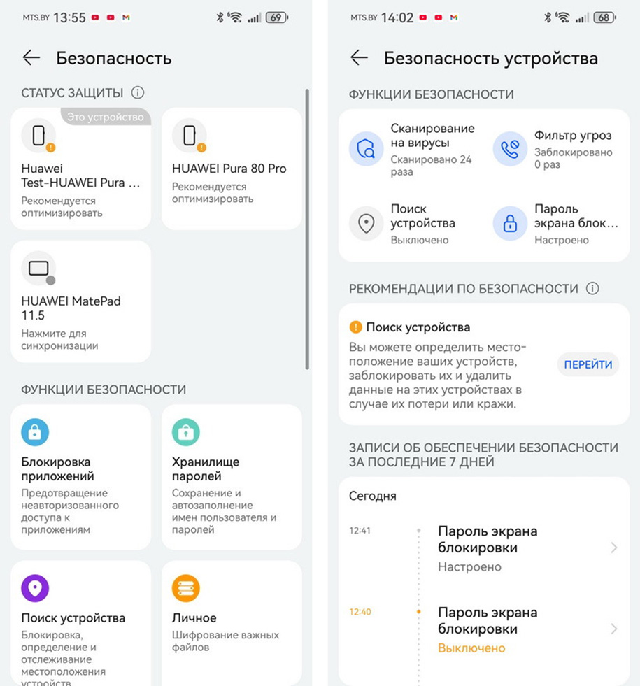 Полезно, что в Центре отражается статус не только самого смартфона, но и устройств, связанных через функцию «Суперустройство» и авторизованных под тем же HUAWEI ID. То есть, можно удаленно проверить, какое устройство находится под угрозой, и изменить настройки прямо со смартфона.
