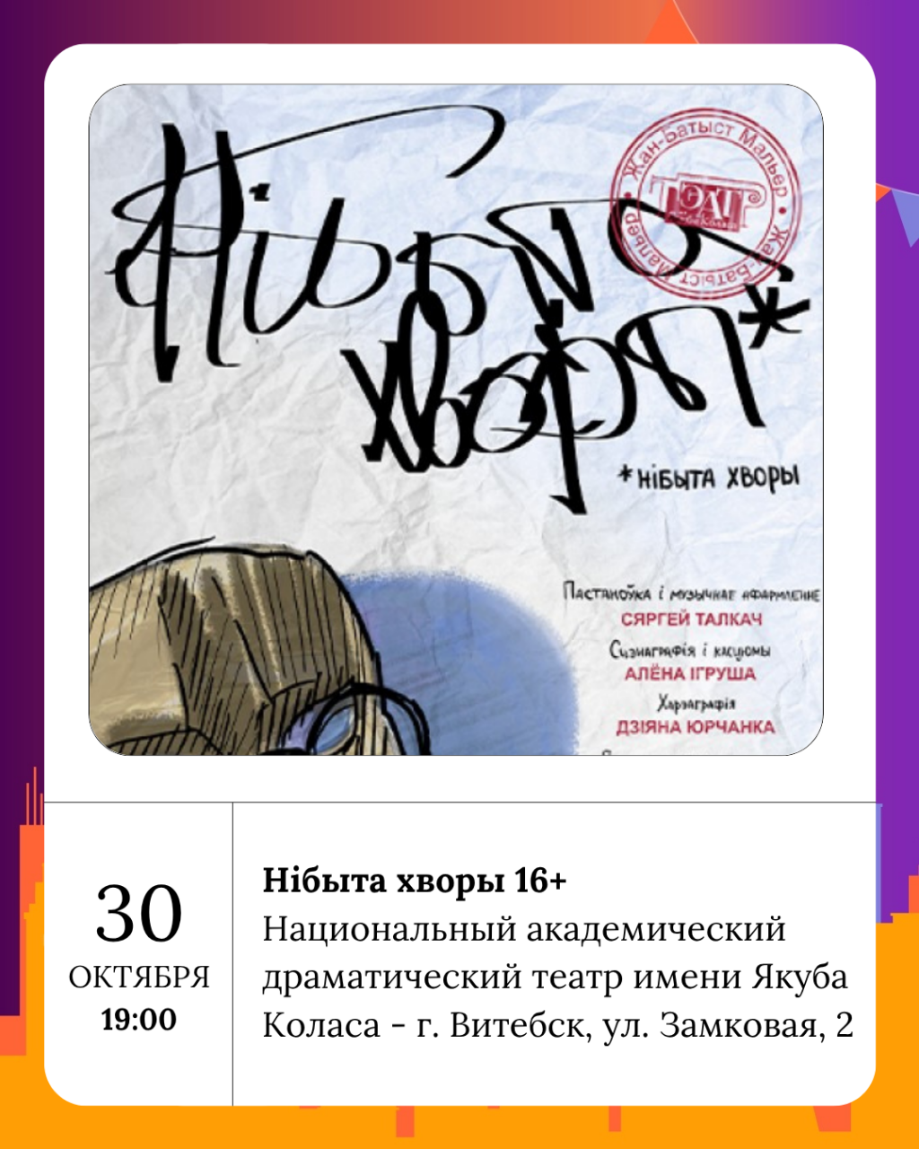 Понедельник — это не приговор, а повод выбраться в город! 27 октября в Витебске стартует неделя, которая обещает быть насыщенной и яркой. Да, понедельник — день сурка, кофе и попыток вспомнить, где лежит мотивация. Но культурная афиша города предлагает альтернативу: вместо грусти — кино, вместо прокрастинации — выставки, вместо «ну всё, опять работа» — вечерние спектакли. Кто сказал, что понедельник не может быть праздничным?