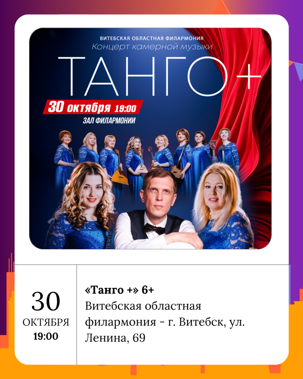 В витебскоой областной филармонии 30 октября пройдет концерт «Танго +» 6+ в исполнении «Витебских виртуозов» – коллектива, родившегося из скромной группы балалаечниц, прошедшего долгий и непростой путь, чтобы стать одним из самых ярких и узнаваемых коллективов Витебска.