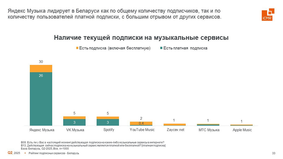 В белорусском сегменте исследование охватило онлайн-кинотеатры и музыкальные стриминговые сервисы, включая оценку узнаваемости брендов, фактического пользования, а также наличия как бесплатных, так и платных подписок.