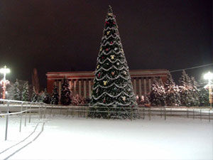 На площади Ленина установлена 30-метровая металлическая конструкция, увешанная искусственными елочными лапками. Ее украшают пояса из мишуры, шары, полумесяцы, оригинальной формы снежинки. Кроме того, елочную гирлянду в этом году оснастили энергоэффективными светодиодными лампочками.