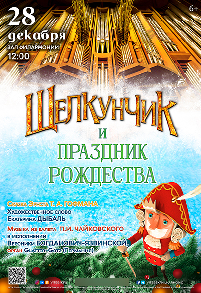 На волшебном рождественском концерте в филармонии «Щелкунчик и праздник Рождества» зрителей ждёт музыка из балета П.И. Чайковского в исполнении органистки Вероники Богданович-Язвинской и сказка Э.Т.А. Гофмана в исполнении Екатерины Дыбаль. 28 декабря, 12.00.
