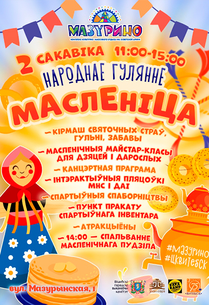 В Витебске же праздничные гуляния, посвященные прощанию с зимой и встрече весны, начнутся 2 марта в 11 часов. Традиционное мероприятие ежегодно соберет жителей и гостей Витебска в парке “Мазурино”, чтобы насладиться обрядовыми развлечениями и снова почувствовать себя беззаботным ребенком.