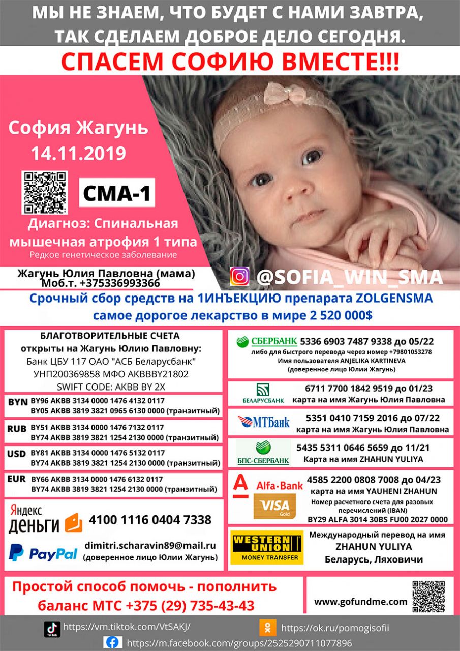 Я прошу всех неравнодушных людей, пожалуйста, помогите нам собрать средства на жизненно необходимый для Софии укол препарата «Золгенсма». Сумма огромная, данное лекарство является самым дорогим в мире. А для меня это цена жизни моего ребенка. Ребенка, который может просто перестать дышать. Ребенка, жизнь которого в одной ампуле.