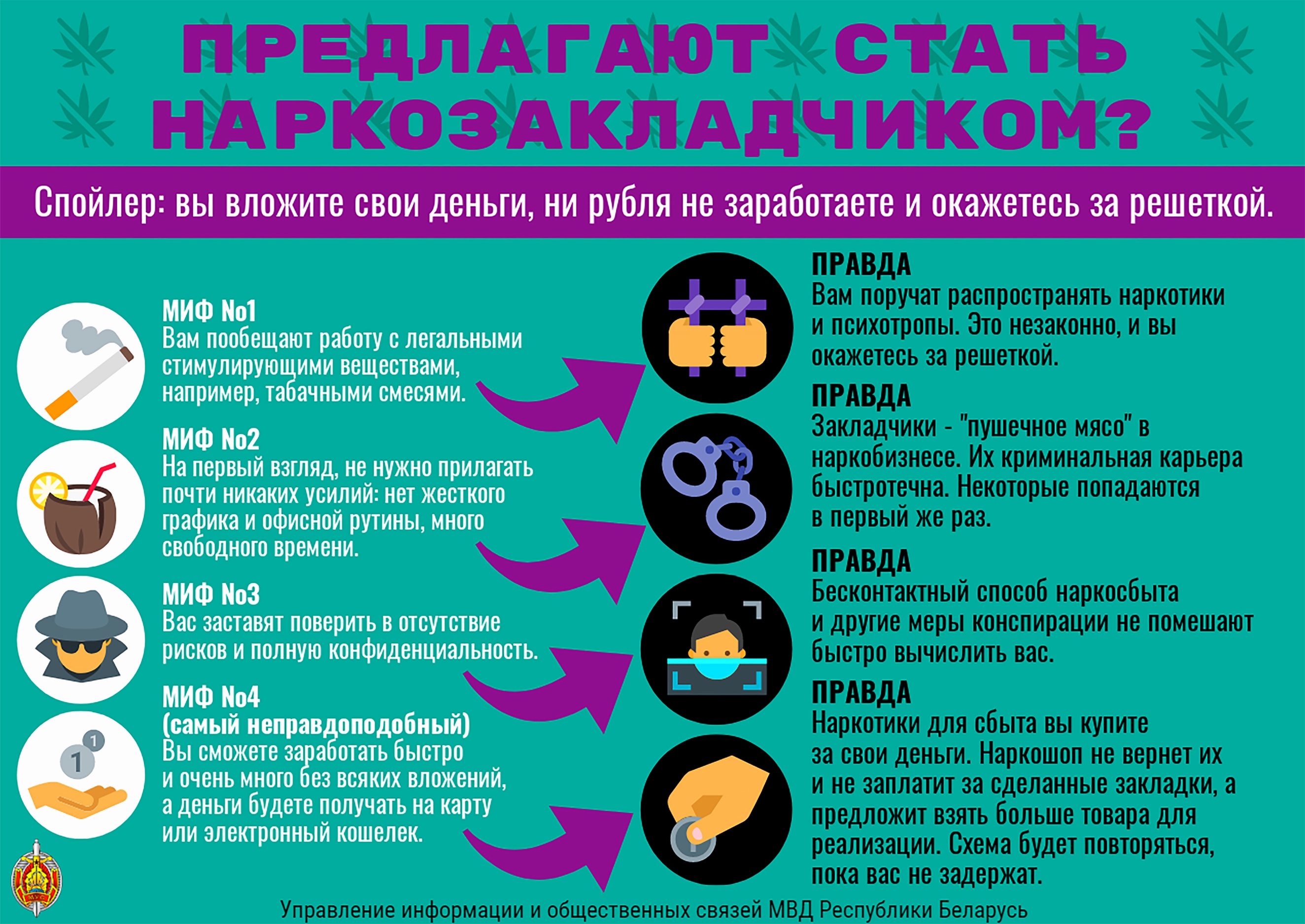 Если вам стало известно о возможном месте сбыта наркотических средств и психотропных веществ или есть подозрение, что конкретное лицо занимается данным видом преступлений сообщите в ОВД администрации Первомайского района г. Витебска по тел. 102; (8-0212) 37-61-02 (городской); + 37529 711-53-16 (МТС); + 37529 310-40-02 (А1).