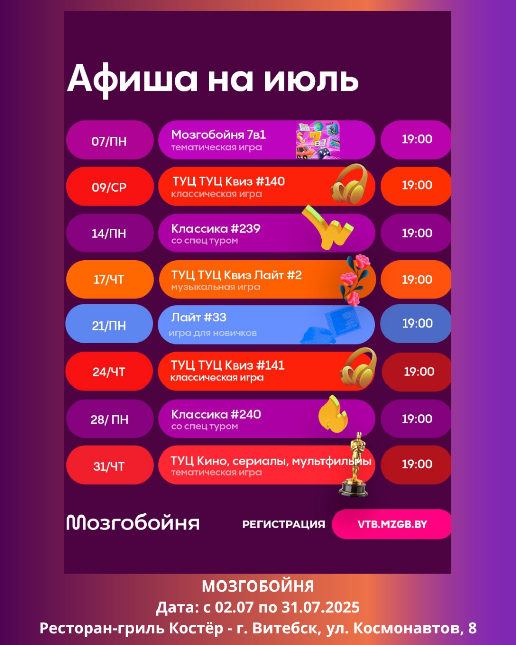 Классика Мозгобойни #240 - игра с вопросами обо всём на свете ждет вас сегодня, а в четверг - Туц Туц Квиз «Кино, сериалы, мультфильмы#2» - идеальная смесь кино и музыки.
