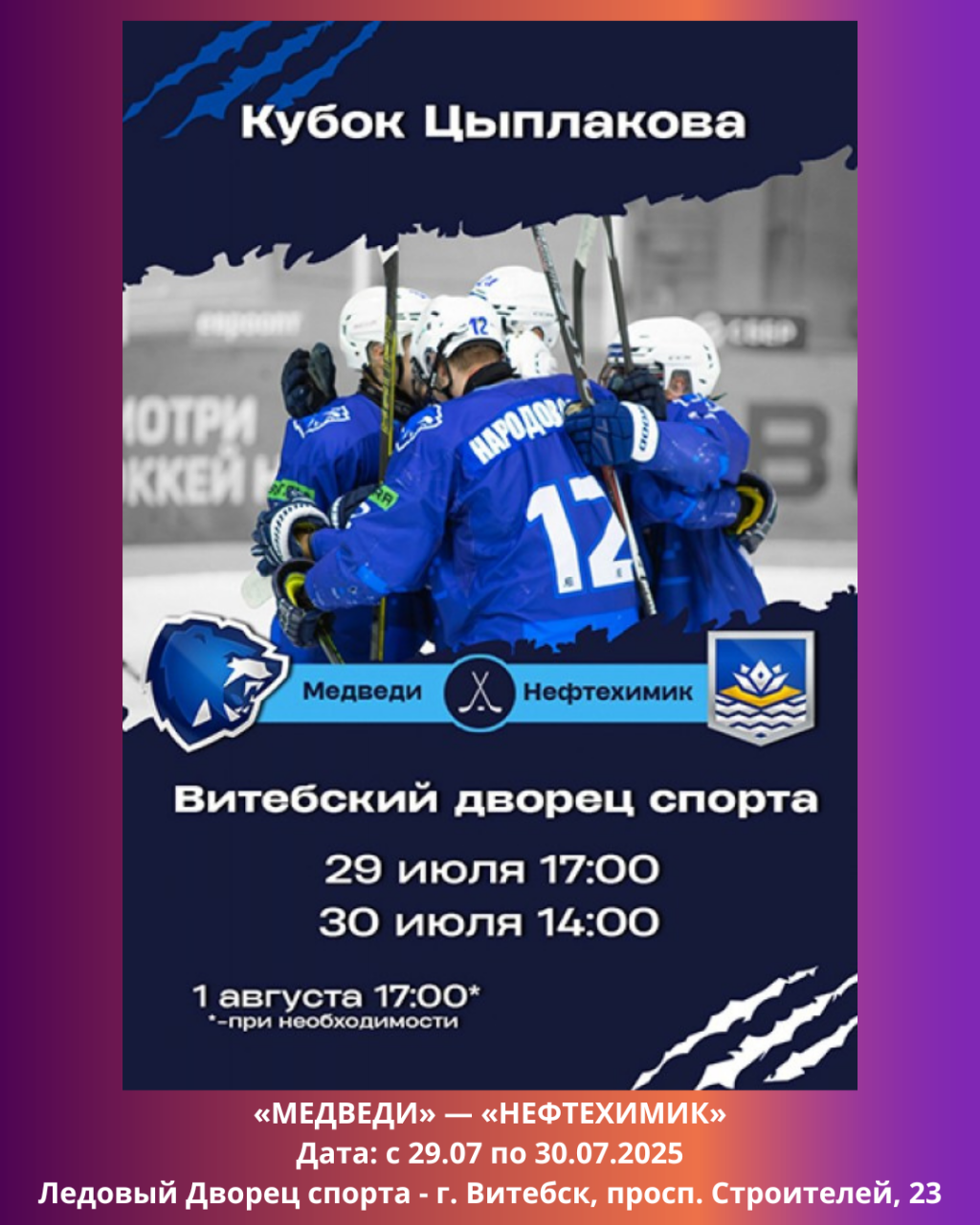 Знакомимся с расписанием Кубка Владимира Цыплакова! «Медведи» сразятся с новополоцким «Нефтехимиком»! Матчи пройдут в Витебском Дворце спорта: 29 июля - в 17:00, 30 июля — в 14:00.