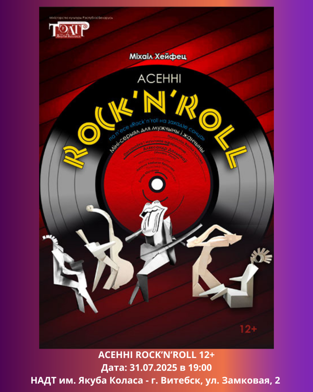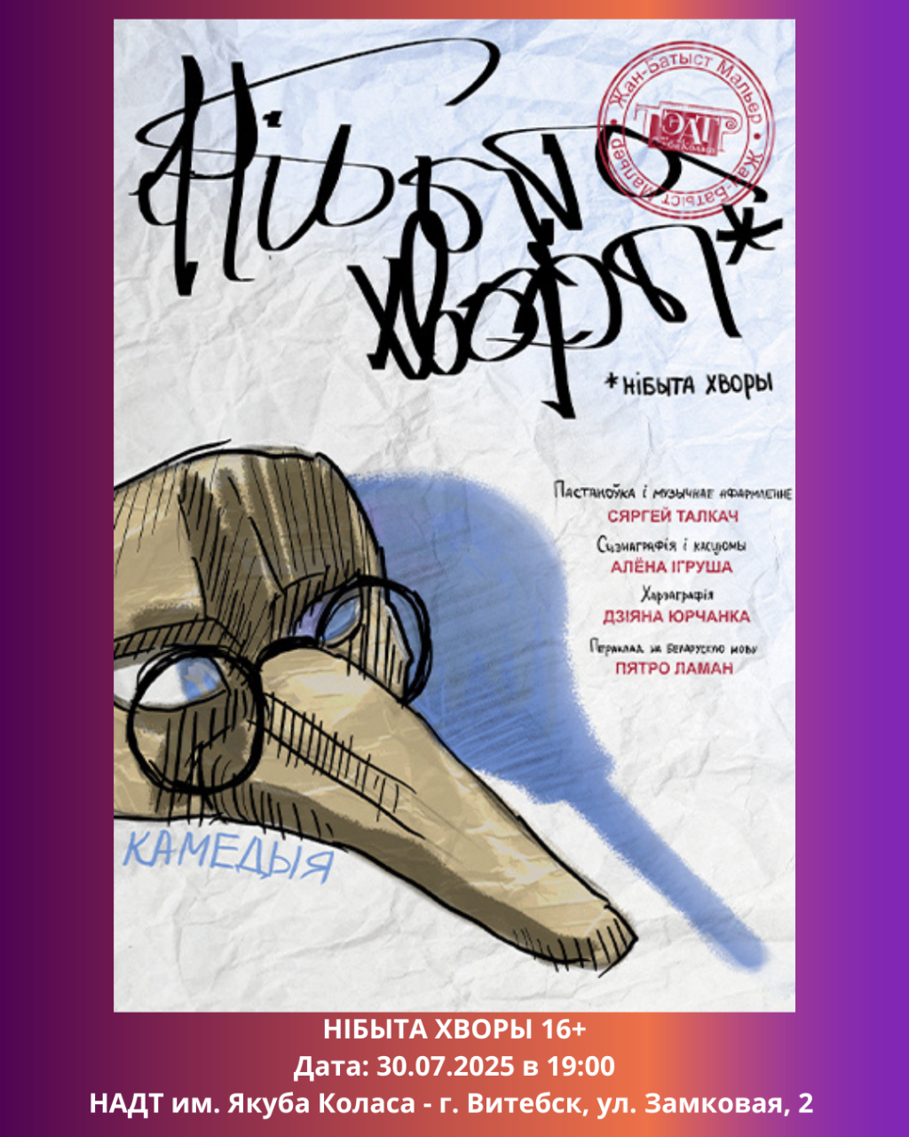 Национальный академический драматический театр имени Якуба Коласа в среду приглашает на спектакль Нібыта хворы 16+, а в четверг - на Асенні Rock’n’roll 12+.