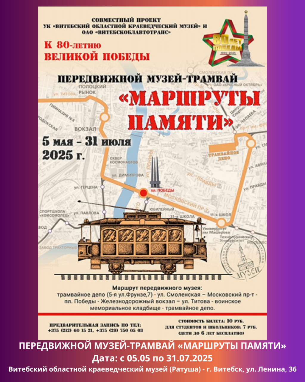 Передвижной музей-трамвай «МАРШРУТЫ ПАМЯТИ» работает по 31 июля. В программе экскурсии: знакомство с историей Витебска и Витебского трамвая, героическими событиями и памятными местами города, связанными с Великой Отечественной войной.