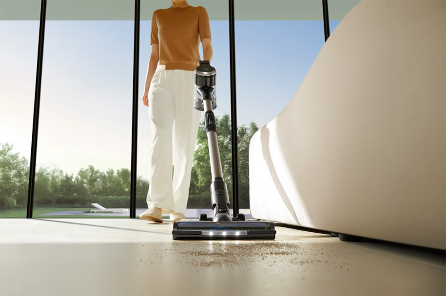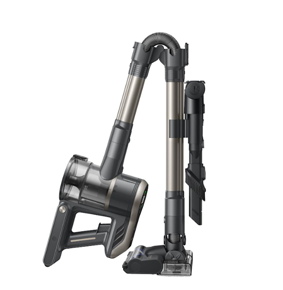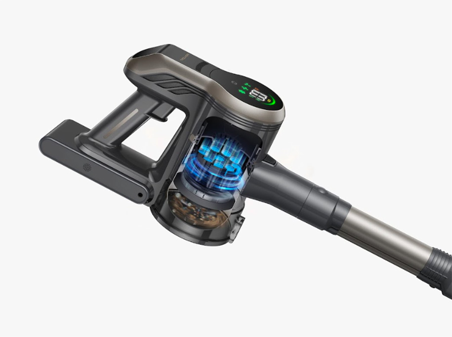 На корпусе размещен LED-дисплей с индикацией режима работы, уровня заряда и состояния обслуживания. Кнопки управления вынесены на ручку для быстрого переключения между режимами и регулировки мощности. Встроенная подсветка перед щеткой помогает замечать пыль и мусор в затемненных углах, под мебелью или по краям стен.