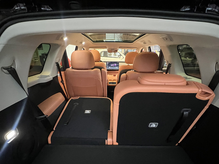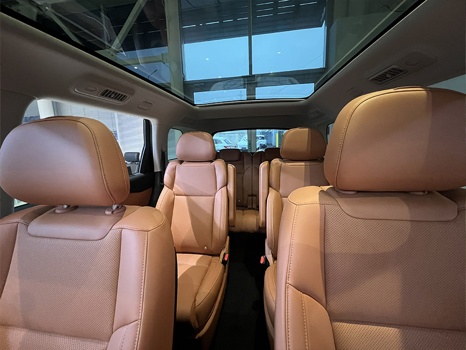 Салон разделен на три ряда и вмещает 6 полноценных мест с креплениями для детских кресел. Ставка сделана на технологии: сиденья с памятью и вентиляцией, три дисплея и мощная акустика Dolby Audio. Продуманы трехзонный климат-контроль и обогрев сидений второго ряда. Багажник вмещает до 652 литров со сложенными сиденьями. Над головой – панорамная крыша.