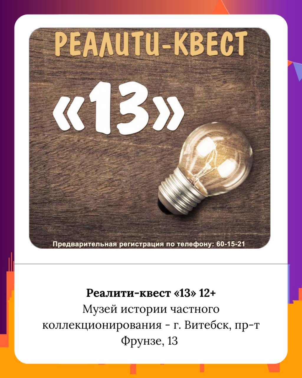 Реалити-квест «13» 12+ можно пройти в музее истории частного коллекционирования. Квест имеет свою уникальную сюжетную линию (по страницам истории здания на проспекте Фрунзе, 13). Что скрывается под числом «13» и готовы ли вы это узнать? Логика, эрудиция, скорость и другие суперспособности помогут вам на пути к истине!