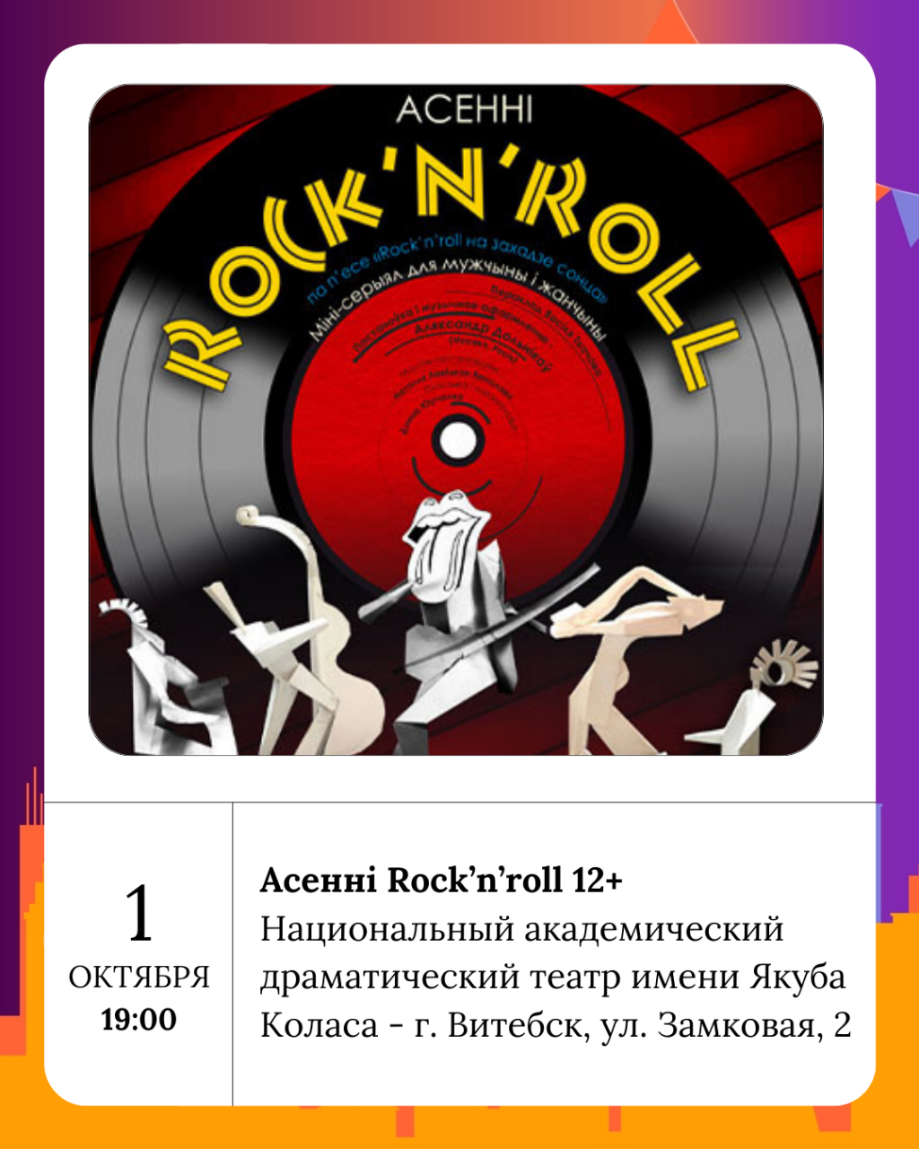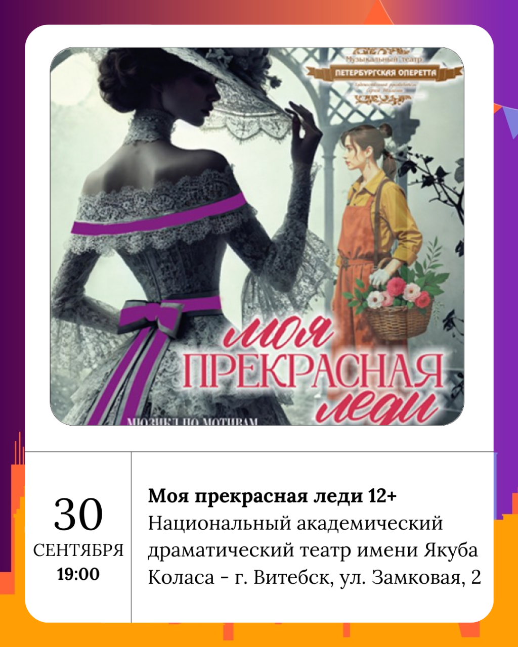 Музыкальный театр «Петербургская оперетта» под управлением заслуженного артиста России Сергея Шалагина представляет музыкальный спектакль «Моя прекрасная леди» во вторник на сцене национального академического драматического театра имени Якуба Коласа. В среду витебские актеры сыграют Асенні Rock’n’roll 12+.