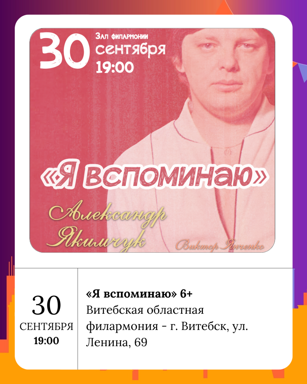 «Нет тебя прекрасней», «Я вспоминаю», «Гляжусь в тебя, как в зеркало», «Крыша дома твоего», «Белый теплоход», «Море, море…» Пожалуй, нет сегодня такого человека, которому были бы незнакомы эти песни. И они прозвучат в витебской областной филармонии 30 сентября в исполнении артистов филармонии.