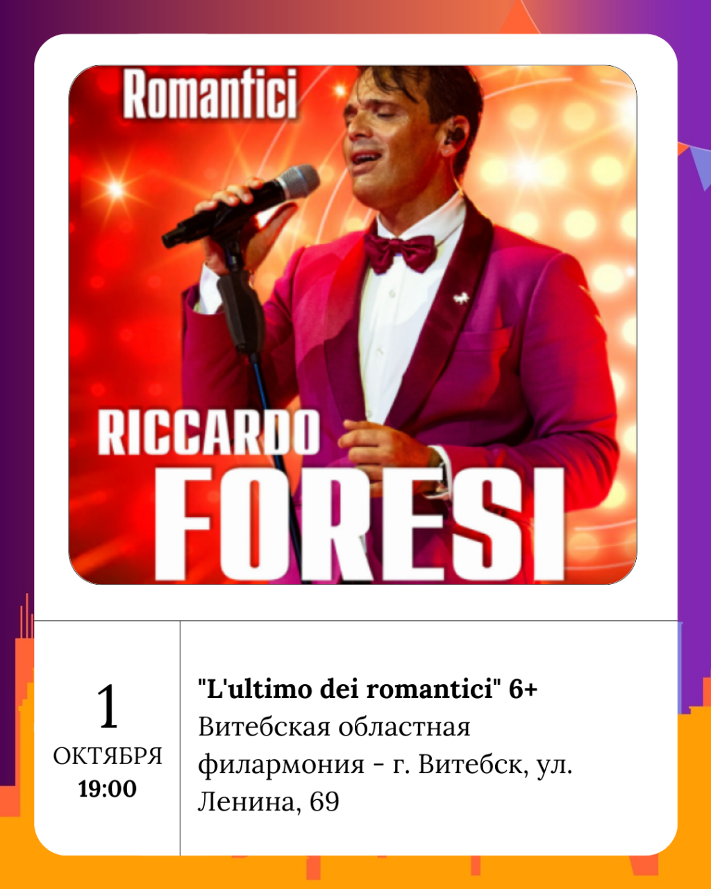 1 октября там же пройдет концерт "L'ultimo dei romantici" 6+. Программу представит Riccardo Foresi — 45-летний итальянский певец, трубач, автор песен и музыкальный продюсер.
