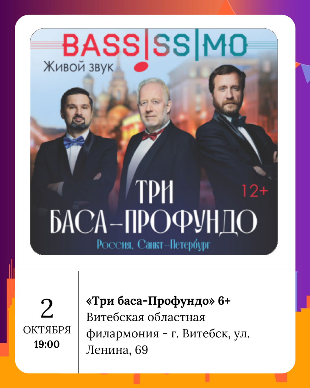 А 2 октября на сцену выйдут Три баса-профундо — не имеющий аналогов в мировой практике российский музыкальный проект, возникший в Санкт-Петербурге в 2009 году и объединивший в единый виртуозный ансамбль солирующих басов, обладающих максимально низкими певческими голосами.