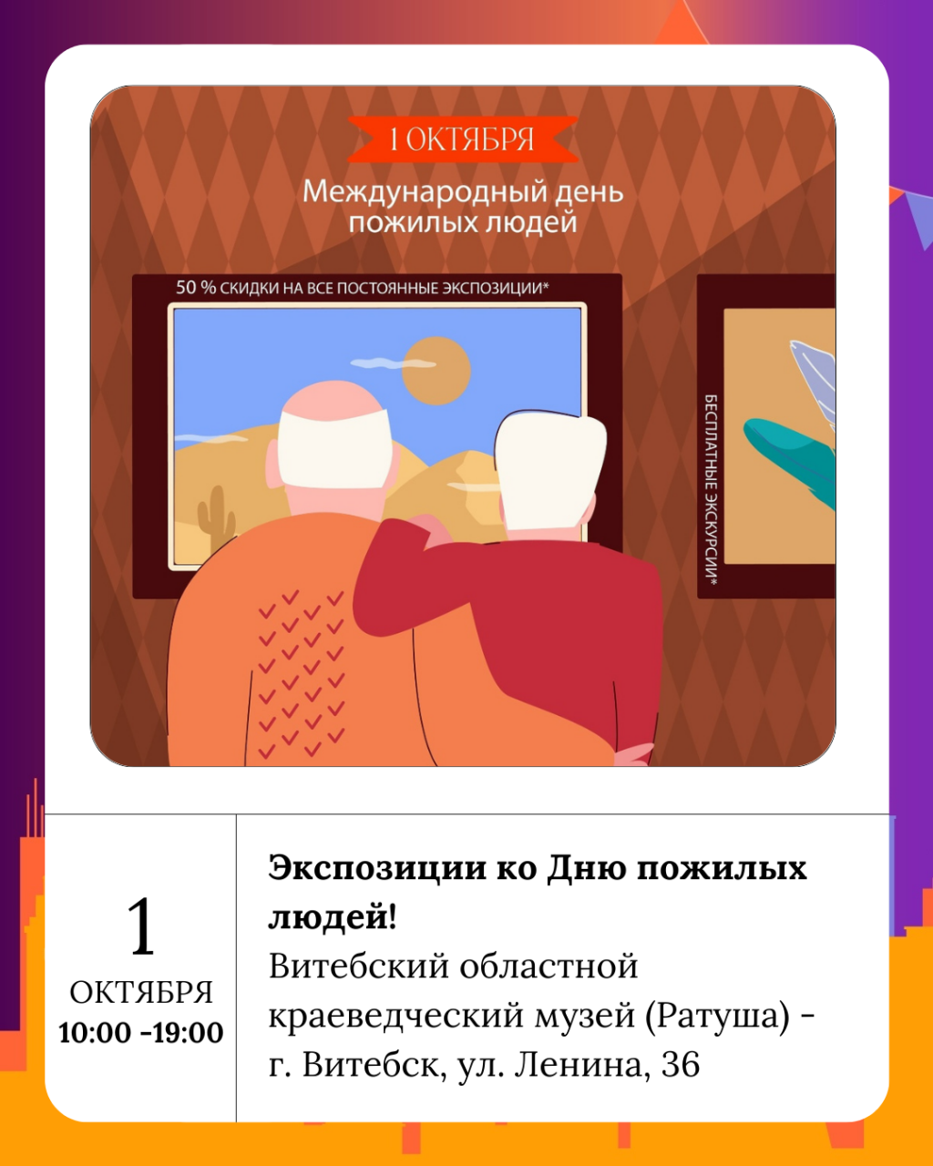 Витебский областной краеведческий музей присоединяется к Республиканской акции «Уважение. Забота. Ответственность» и приглашает людей преклонного возраста 1 октября 2025 г., среда, в рамках празднования Международного дня пожилых людей с 11:00 до 19:00 со скидкой 50 % на входные билеты посетить постоянные экспозиции из фондов музея в Ратуше, Художественном музее, Музее истории частного коллекционирования, с 10:00 до 18:00 в Музее-усадьбе И.Е. Репина «Здравнёво».