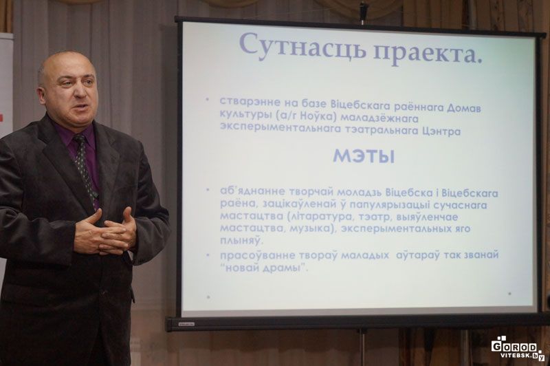Юрий Ивановский « Молодежный экспериментальный театральный Центр г. Витебска и Витебского район». Юрий предлагает создать на базе Витебского районного дома культуры (а\г Новка) молодежный экспериментальный центр. Объединить творческую молодежь, которая заинтересована в популярности современного искусства (литература, театр, музыка). А также продвижение произведений молодых авторов. А потом развиваться вместе, возможно не только на уровне города, но и по всей стране и дальше. |