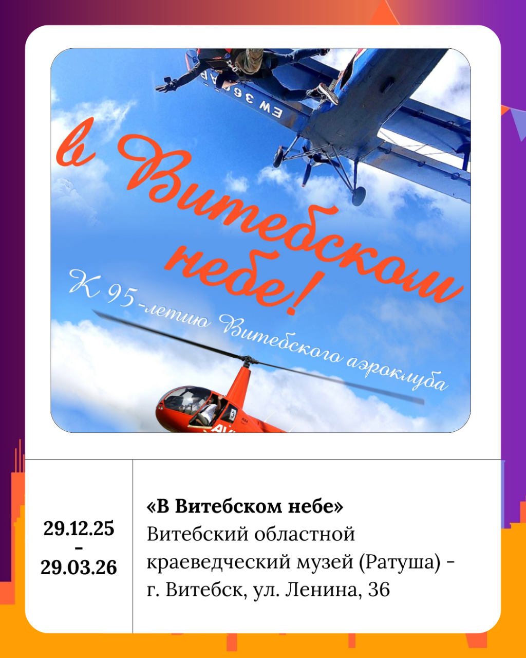 29 декабря в 15:00 приглашаем всех желающих на открытие выставки «В Витебском небе», к 95-летию Витебского аэроклуба ДОСААФ в Ратуше. Вот уже 95 лет небо Витебска прорезают следы самолетов и украшают купола парашютов. Выставка «В Витебском небе» — это история о мечте, ставшей профессией, и о смелости, ставшей традицией.
