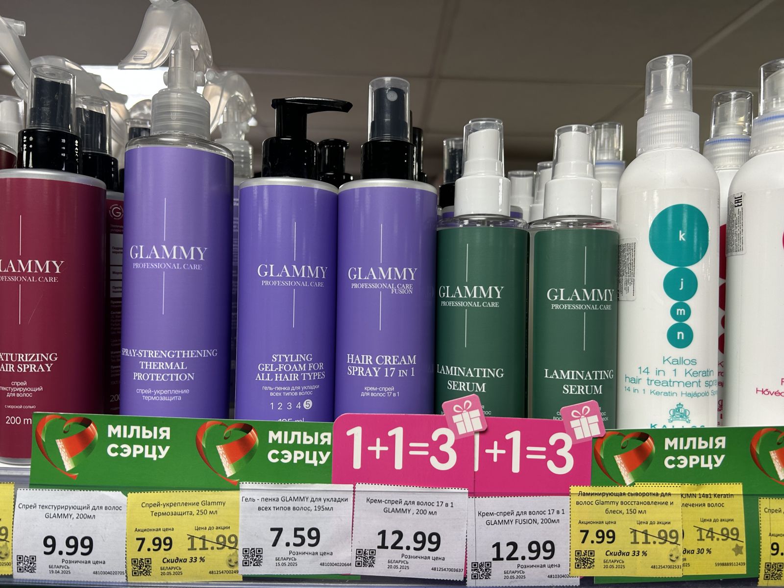 Акция «1+1=3» действует на шампуни, бальзамы, спреи, маски, пилинги для волос Glammy Fusion. Купив два средства, вы получите третье с наименьшей стоимостью за 1 копейку. Для примера, сыворотка или спрей-термозащита для волос этого бренда стоят 7,99 руб.
