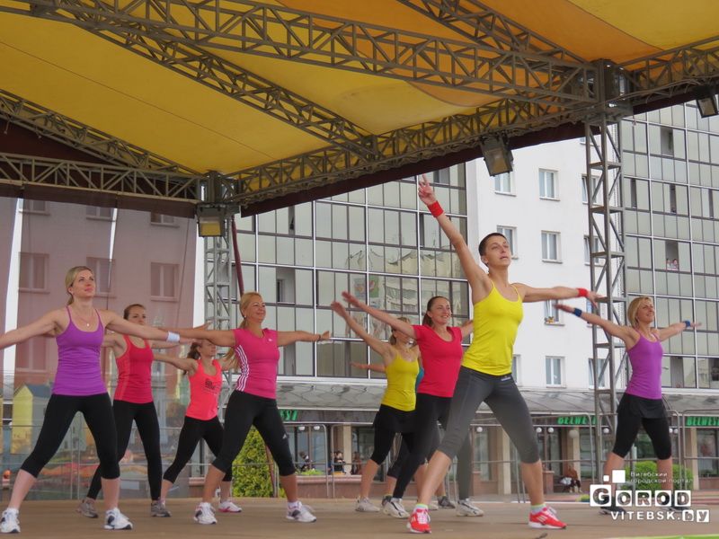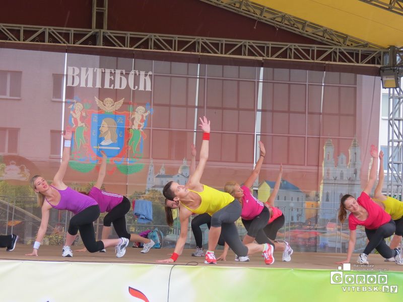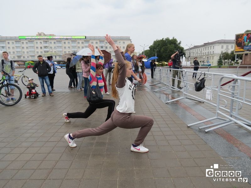 Но прежде чем налечь на педали, велосипедисты и случайные прохожие сделали энергичную зарядку вместе с инструкторами фитнес-клубов Витебска.