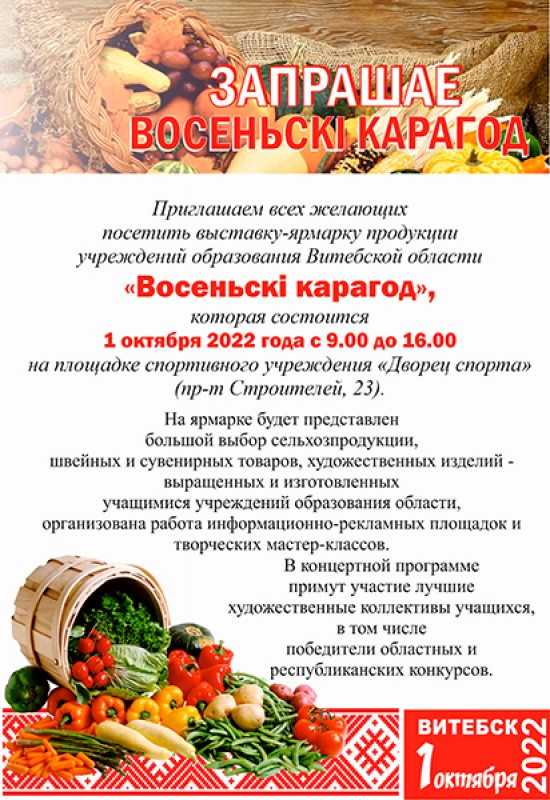 1 октября 2022 года с 9.00 до 16 00 около Ледового дворца приглашаем вас посетить выставку-ярмарку продукции учреждений образования Витебской области. На ярмарке будет представлен широкий выбор сельхозпродукции, швейных и сувенирных товаров, художественных изделий - выращенных и изготовленных учащимися учреждениями образования области, организована работа творческих площадок, мастер-классов, концертной программы, в которой примут участие художественные коллективы учащихся, в том числе победители областных и республиканских конкурсов, мероприятий.