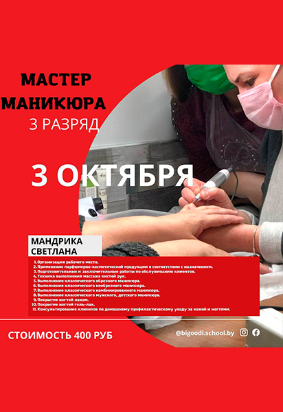 До 1 октября 2024 года можно подать документы на обучение в Витебском женском духовном училище. Учебный центр БиGOODи (БИГУДИ) 3 октября приглашает на курс МАСТЕР МАНИКЮРА - 3 разряда. Больше курсов в разделах Курсы и Обучение.