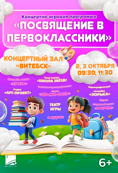 Центр культуры «ВИТЕБСК» приглашает новоиспечённых школьников 2 и 3 октября в 9:30 и 11:30 в концертный зал «ВИТЕБСК» на традиционную концертно-игровую программу «ПОСВЯЩЕНИЕ В ПЕРВОКЛАССНИКИ».
