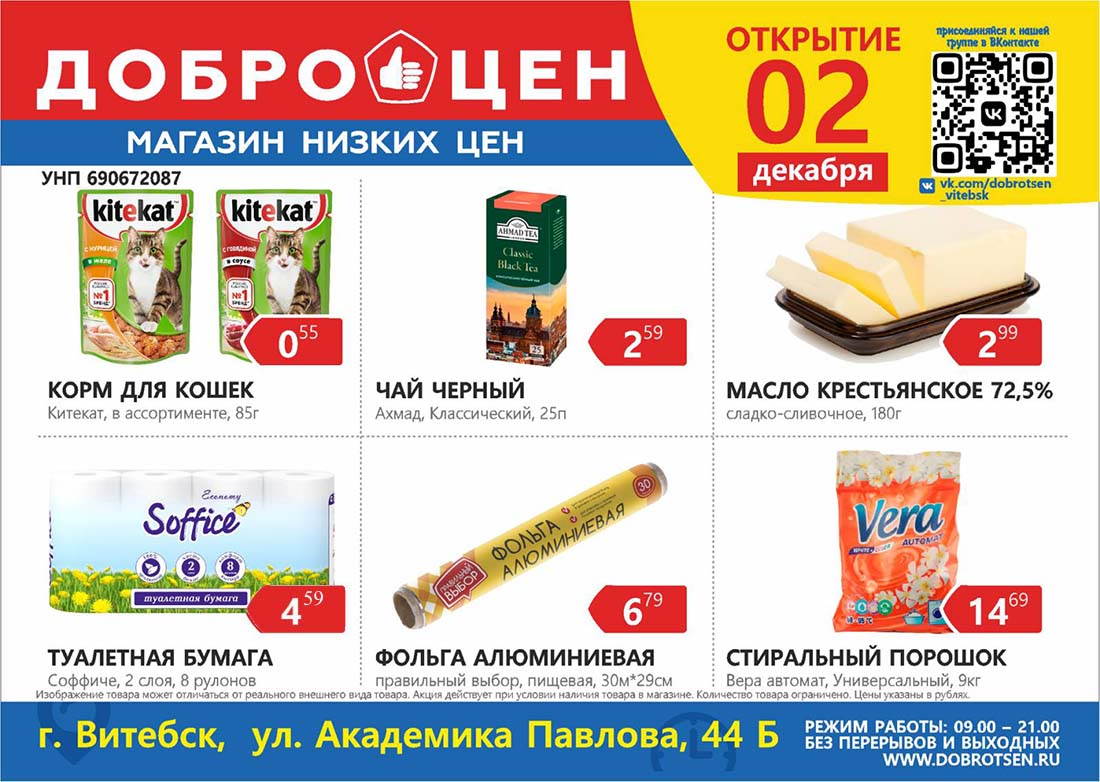 Отличная новость для всех любителей низких цен и широкого ассортимента товаров! В Витебске распахнёт свои двери новый дискаунтер «ДОБРОЦЕН»! Приходите всей семьей на открытие, которое состоится в пятницу, 2 декабря в 10:00, по адресу: улица Академика Павлова 44Б.
