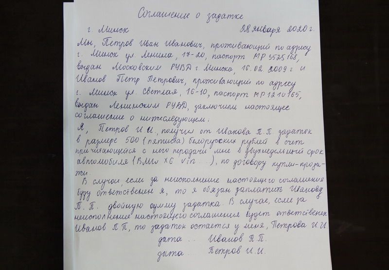 — На мой взгляд, лучше не оставлять предоплату: на планете и так перепроизводство машин — их хватит на всех. Но если очень хочется, то следует взять расписку о получении контрагентом денежных средств. Предусмотреть в ней дату, подпись, подробно описать предмет сделки, сверить паспортные данные с теми, что будут фигурировать в расписке, — все это минимальные требования. В случае неисполнения соглашения ответственное за это лицо возвращает задаток в двойном размере (ст. 351-352 ГК РБ).