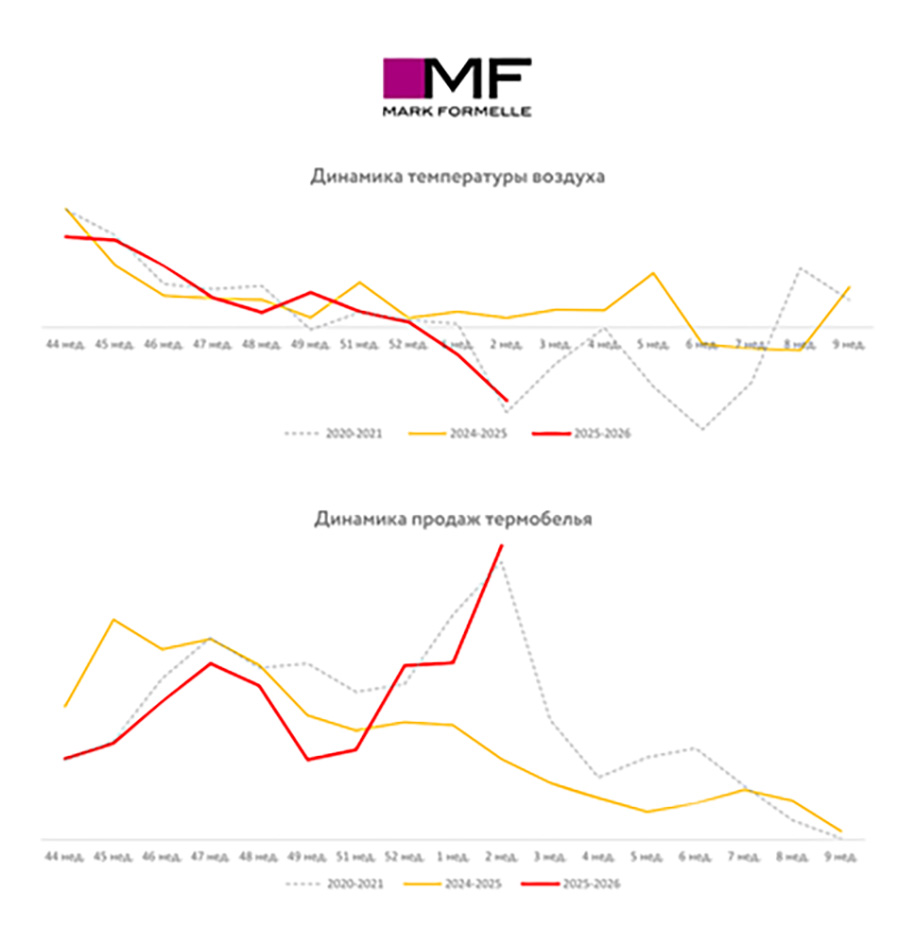 Так, только с 5 по 11 января 2026 года продажи термобелья Mark Formelle выросли в 3,6 раза в сравнении с аналогичным периодом прошлого года. Такой же пиковый спрос наблюдался около 5 лет назад при схожей погоде.