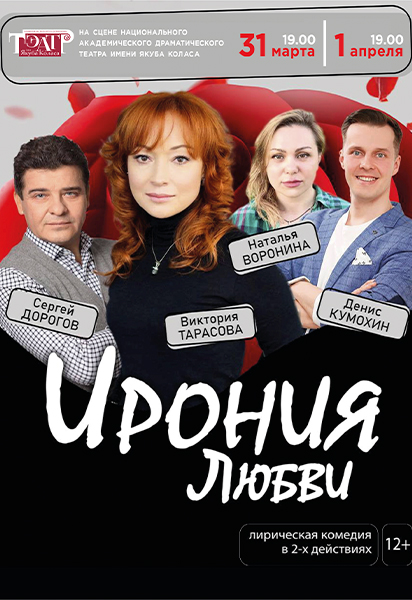В национальном академическом драматическом театре имени Якуба Коласа сегодня и завтра, 1 апреля, ИРОНИЯ ЛЮБВИ 12+ в исполнении Сергея Дорогова, Виктории Тарасовой, Натальи Ворониной и Дениса Кумохина. В среду там же Сотнікаў 16+.