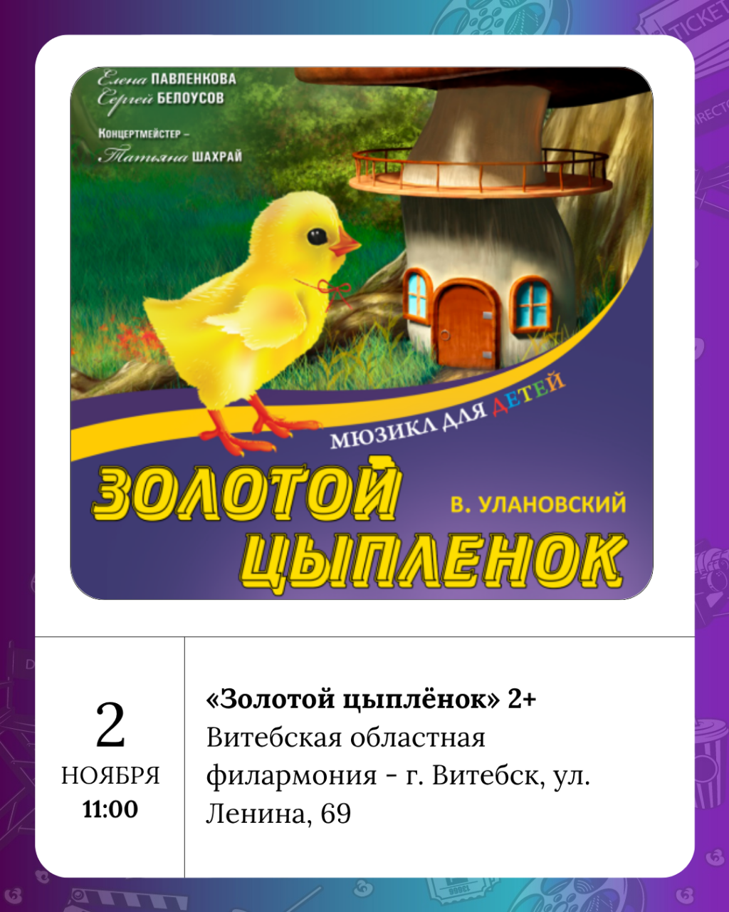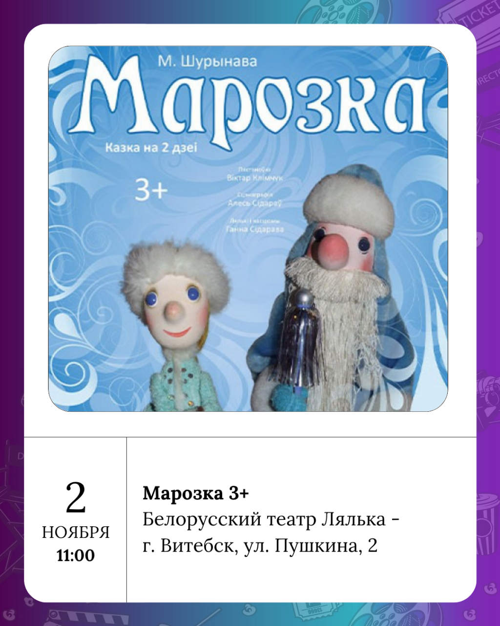 Театр имени Якуба Коласа - Саня, Ваня з імі Рымас 16+, Лялька - Марозка 3+ и Осторожно, город просыпается 2+, филармония - «Золотой цыплёнок» 2+.