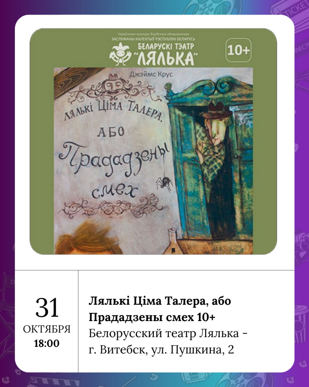 А сегодня можно отправиться в национальный академический драматический театр имени Якуба Коласа, где нас ждут на спектакль Вяселле-буф 16+. Или в белорусский театр Лялька, где расскажут про Лялькі Ціма Талера, або Прададзены смех 10+.