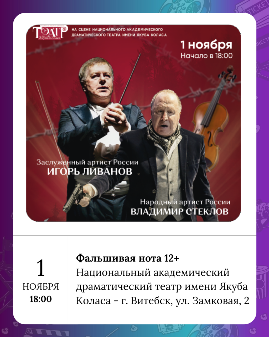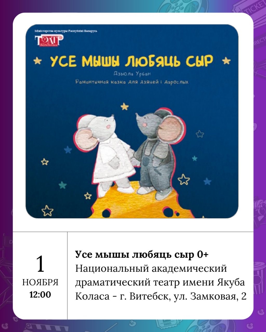 Усе мышы любяць сыр 0+, Фальшивая нота 12+ - в Коласовском, Дзюймовачка 3+ - в Ляльке, «Герои нашего времени» 3+ - в филармонии.