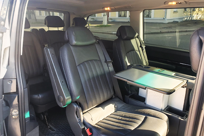 8 мест, TV, DVD, микрофон, индивидуальный кондиционер для каждого пассажира, откидывающиеся сидения с подлокотниками, багажное отделение, автономный отопитель салона.