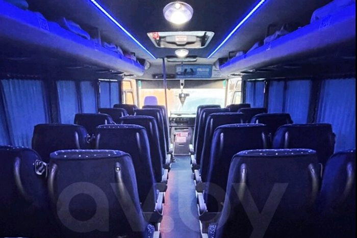18 мест, TV, DVD, микрофон, индивидуальный кондиционер для каждого пассажира, откидывающиеся сидения с подлокотниками, багажное отделение, автономный отопитель салона